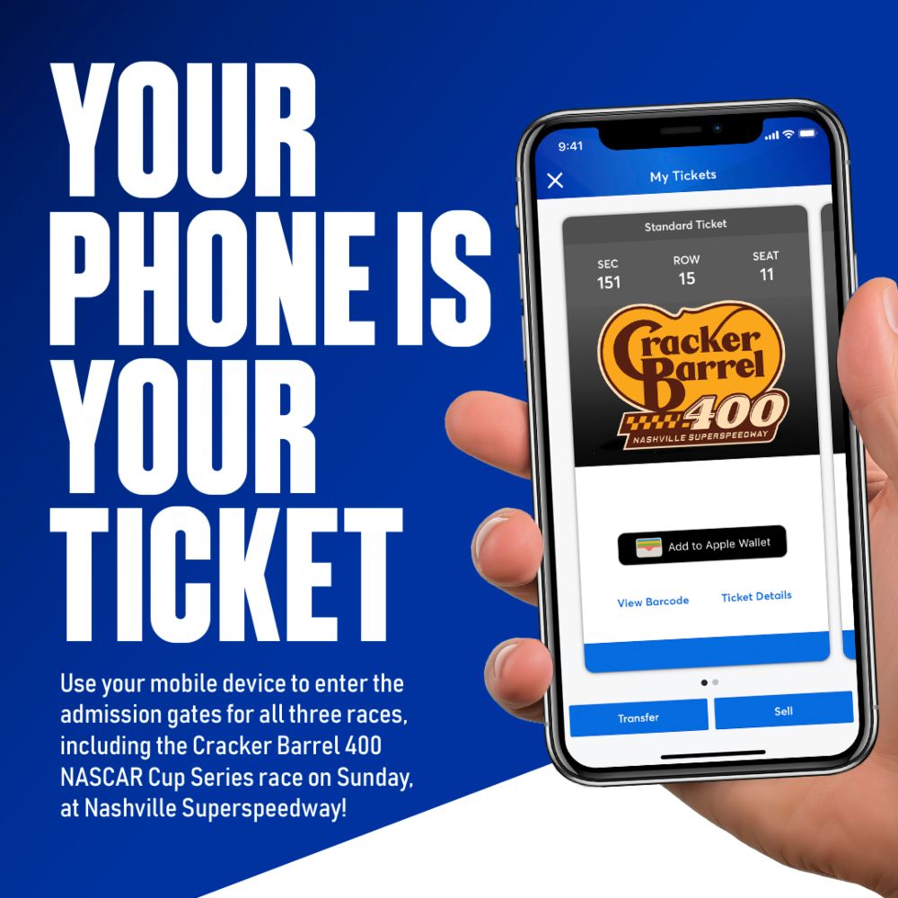 With paperless ticketing, you are able to enter through the gates without the need of a physical ticket. All ticketholders will now use the mobile Nashville Superspeedway app available free from the Apple App Store and Google Play Store. Once you log in, your digital tickets will be placed in your Nashville Superspeedway account within the app. The ticket-taker will scan your tickets in the app when you arrive, and you’re in!